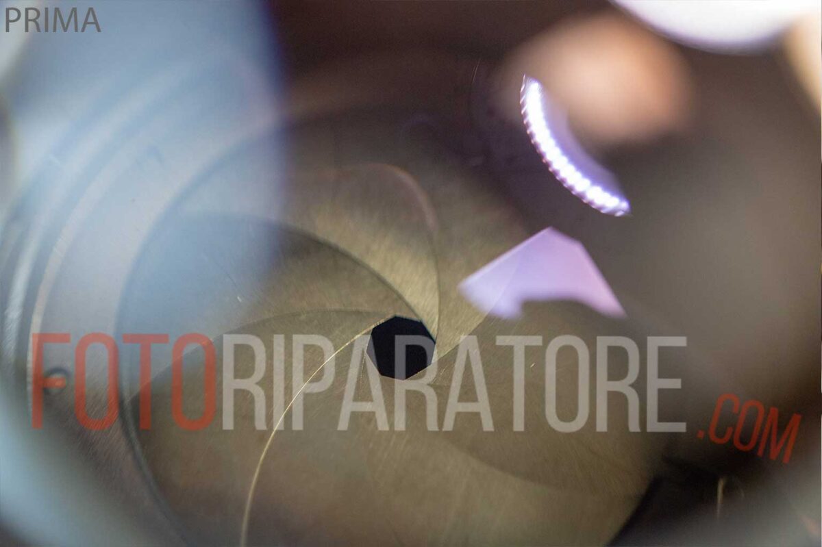Fatto questo abbiamo smontato completamente l’obiettivo, pulito e rettificato le lamine del diaframma e rimontato il gruppo diaframma. Abbiamo anche pulito le lenti interne dell’obiettivo che presentavano della polvere.